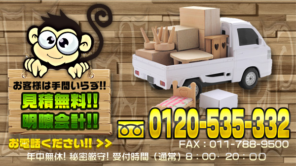 家庭から出た不用品の回収、遺品整理、ゴミ屋敷のお片付け、倉庫・オフィスのお片づけ、家電家具回収、粗大ゴミ、オフィス用品の処分ででお困りでしたら、私たち「札幌不用品回収のモンキーパワー」にお任せください!